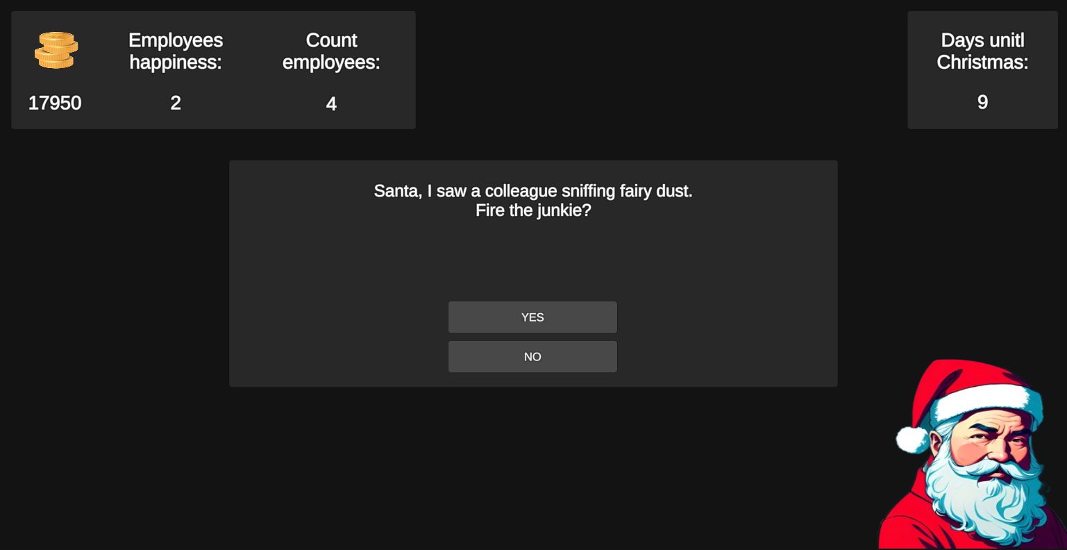The web version of my strategic text game "Dictator Santa" where you need to make decisions in weird situations in the work environment 😈.